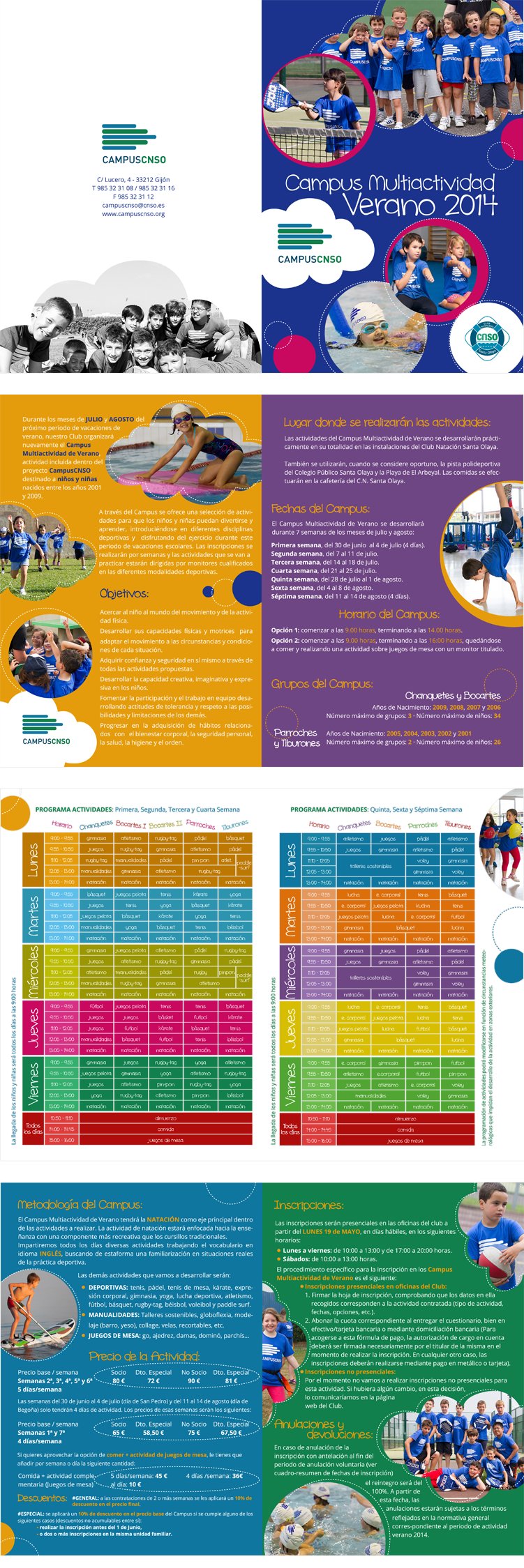 El Club Natación Santa Olaya organizó un Campus Multiactividad para niños. En esta ocasión hemos diseñado un folleto informativo, con las diferentes actividades, objetivos y metodología del deporte que se llevan a cabo dentro del campamento.